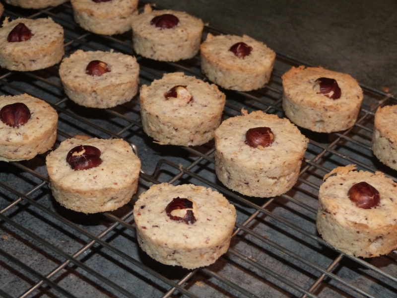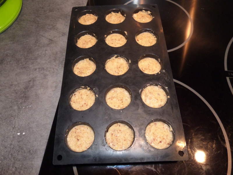 remplissez les moules à la petite cuillère et posez une noisette sur chaque biscuit.