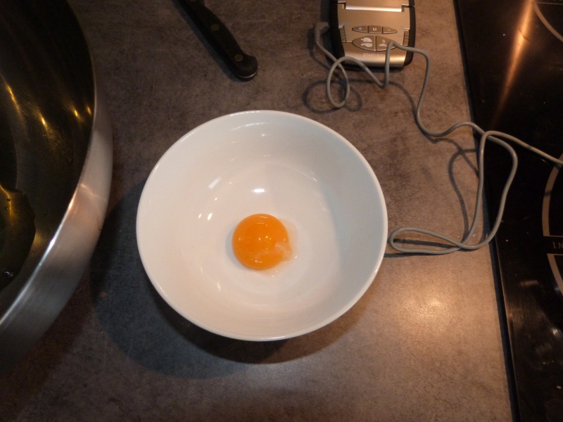 Ajoutez l’oeuf et mélanger rapidement pour ne pas qu’il cuise, puis ajouter ce mélange à la meringue sans la faire retomber.