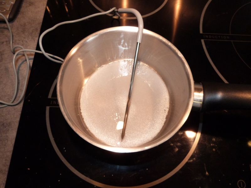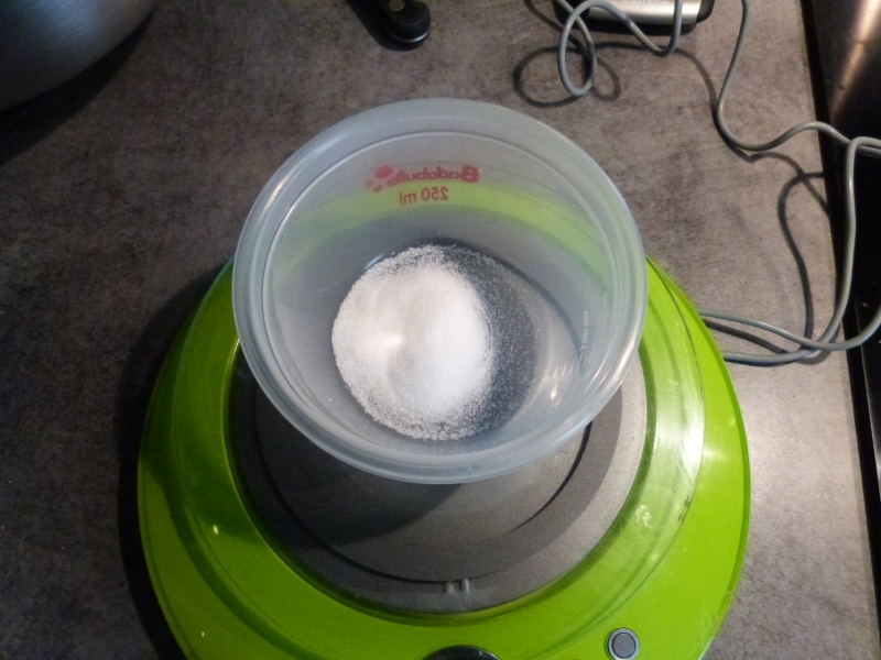 Pesez le sucre et l’eau pour préparer le sirop, ainsi que le sucre extra fin.