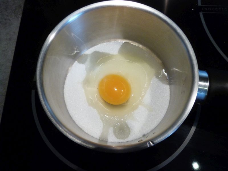Dans une casserole, pesez le sucre, puis ajoutez l’œuf.