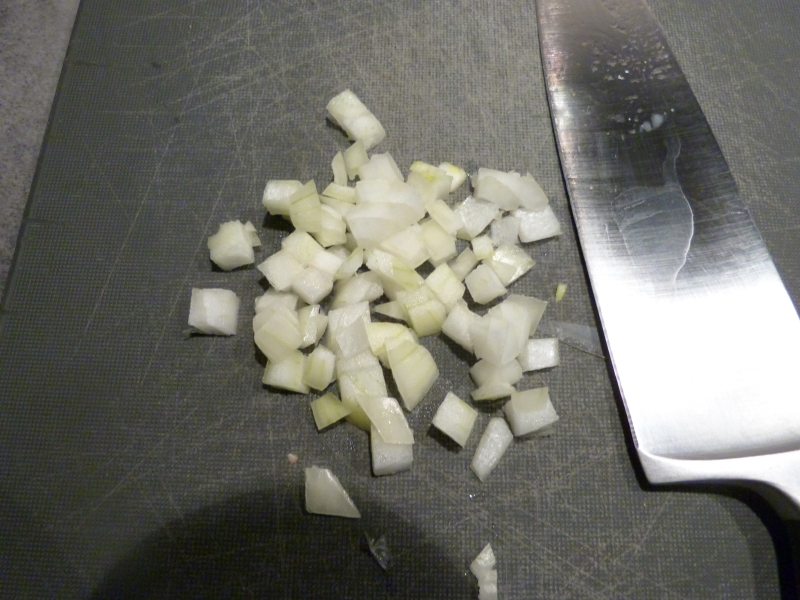 coupez le demi oignon en morceaux d’à peu près la même taille que ceux obtenus pour la pomme de terre.