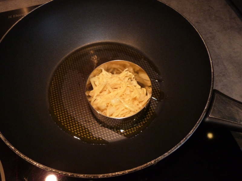 Lorsque la poêle est bien chaude, placez y un cercle, et, dedans, une petite poignée de préparation.