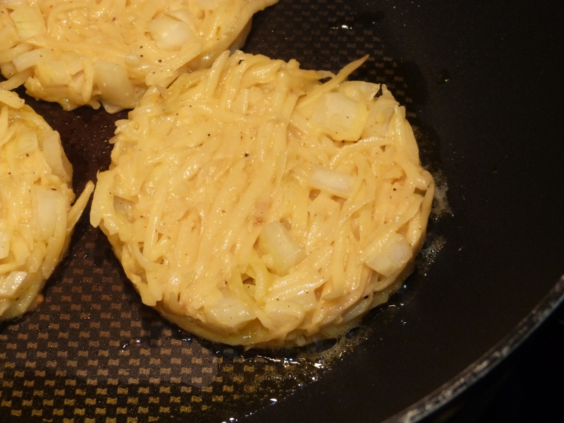 lorsque les 2 cotés sont bien dorés, baissez le feu pour cuire le cœur de la galette, en la retournant de temps en temps (moins délicatement, à présent, elle se tiens bien mieux.)