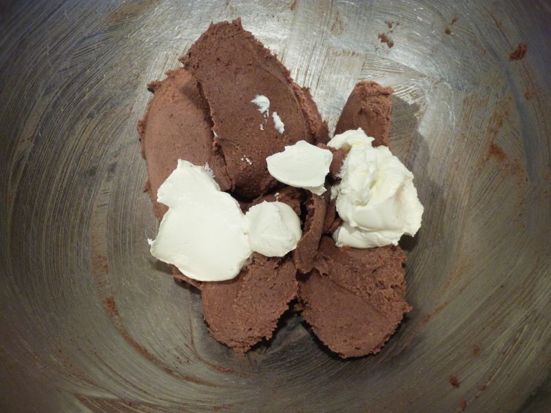 J’ai donc choisi d’y ajouter du mascarpone. Donc, pour 100 g de Gianduja, ajoutez 50 g de mascarpone, et fouettez pour mélanger et aérer les 2 ingrédients.