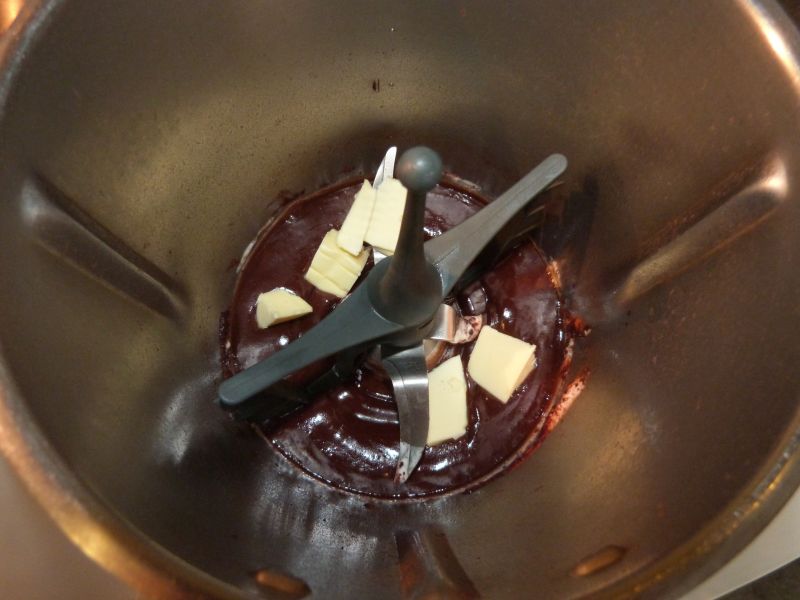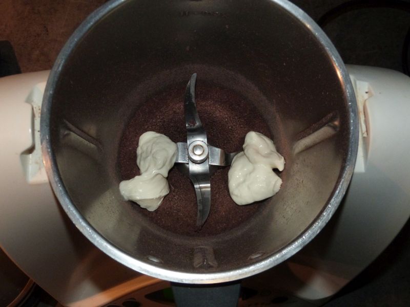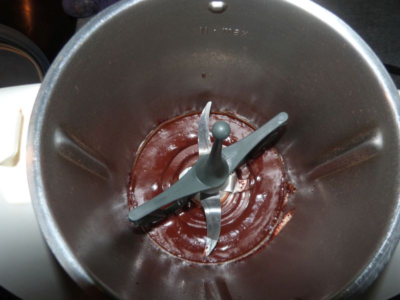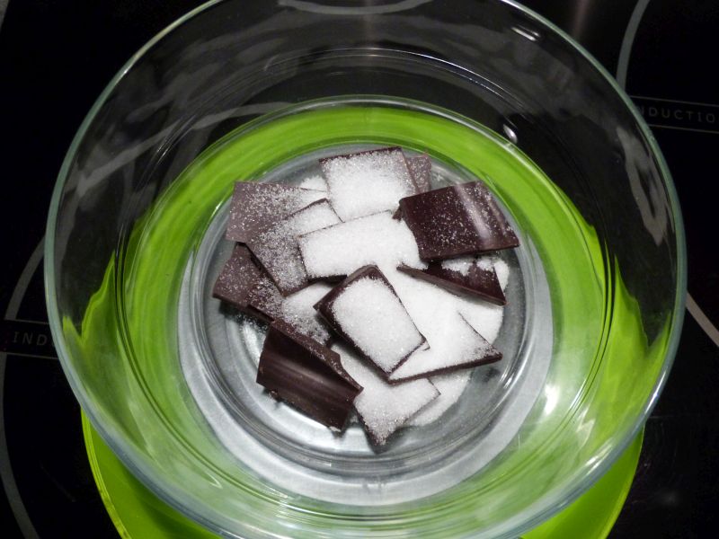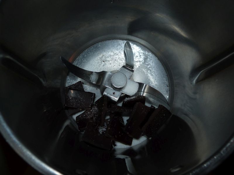 Commencez par peser ensemble le chocolat et le sucre (13 g de sucre, le TM ne sais pas faire)