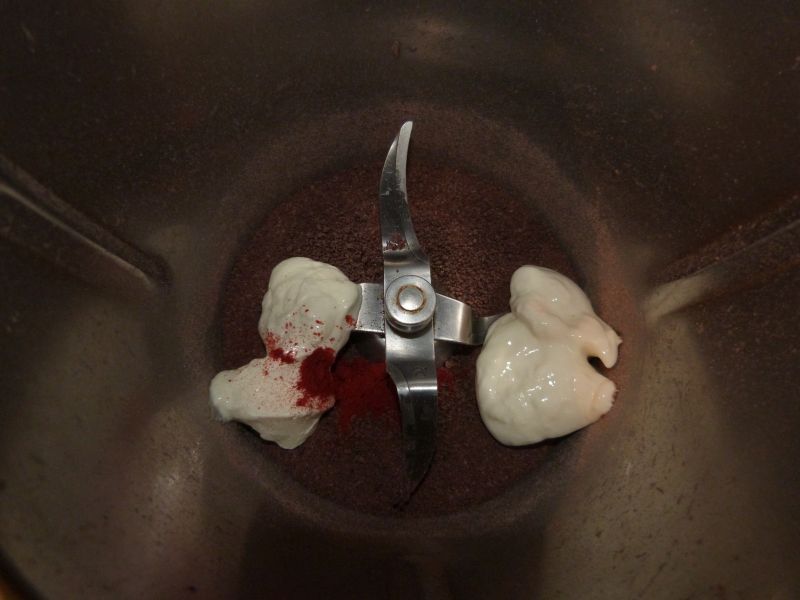 A la sortie du frigo, j’ai ajouté un peu de colorant rouge à ma ganache et l’ai monté (pas trop pour garder un peu de force du chocolat noir).