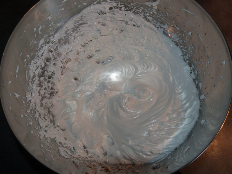 Lorsque le sirop a atteint 120°, versez le en mince filet sur le coté des blancs, sans arrêter de battre, et une fois tout le sirop versé, continuez à battre pendant encore quelques minutes.