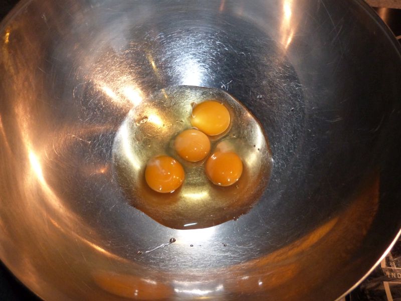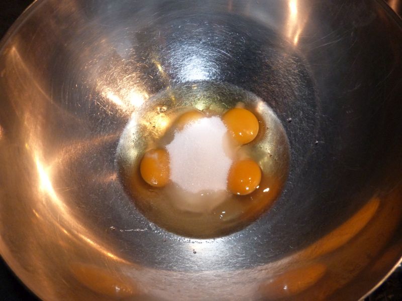 Dans un récipient prévu pour le bain marie, cassez vos œufs, et pesez le sucre.