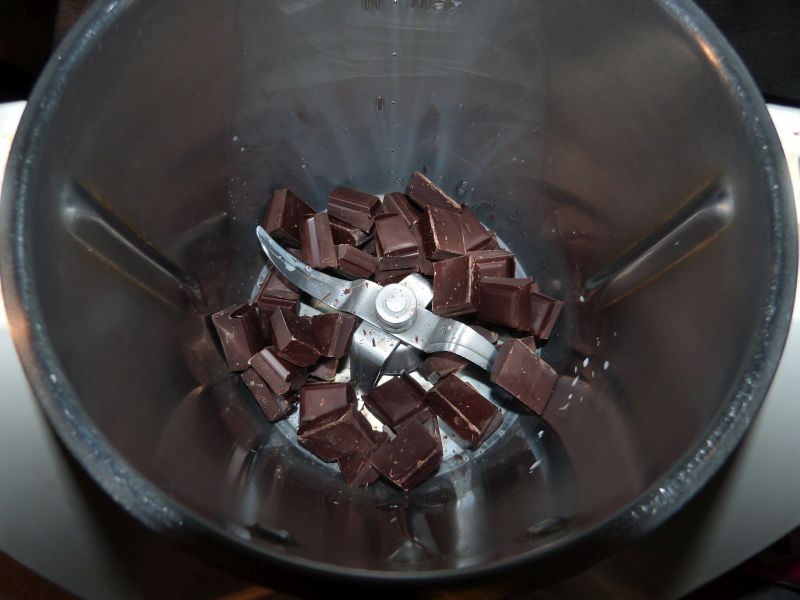 Commencez par réduire le chocolat en poudre, pour cela, cassez le grossièrement dans le bol du TM, puis faites tourner 10 sec vit 9.
