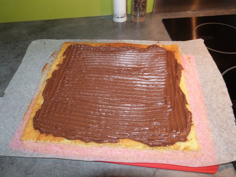 Roulez le biscuit (veillez a bien le serrez lors de cette opération) en vous aidant du papier sulfurisé sur lequel il repose.