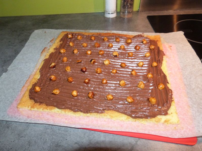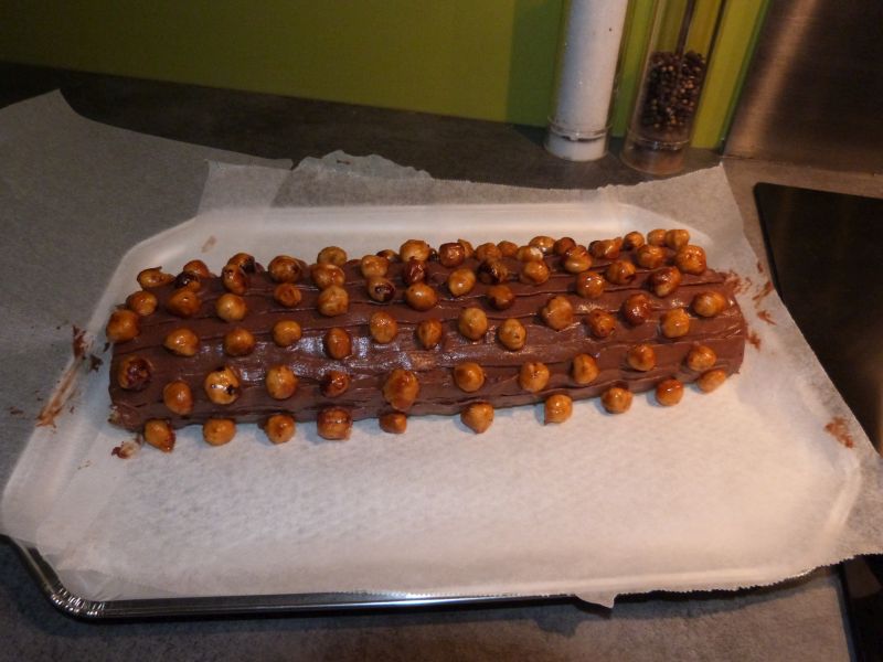 J’ai donc gardé le biscuit à l’identique, ainsi que le principe de parsemer la bûche de noisettes caramélisées (que j’ai gardées entières pour ma part), mais j’ai choisi de la garnir d’une mousseline chocolat praliné.
