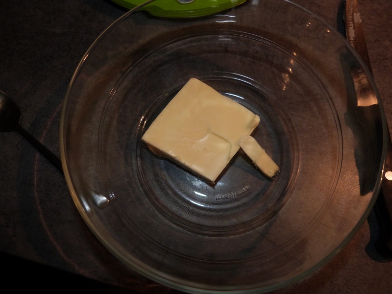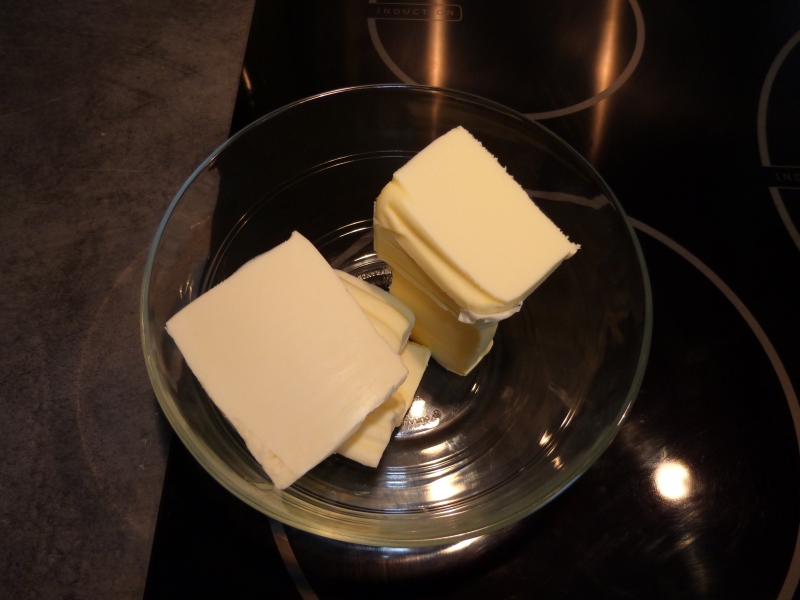 Pendant ce temps, pesez les 200g de beurre en prenant soin de séparer la masse en 2 parts égales (2 * 100 g quoi)