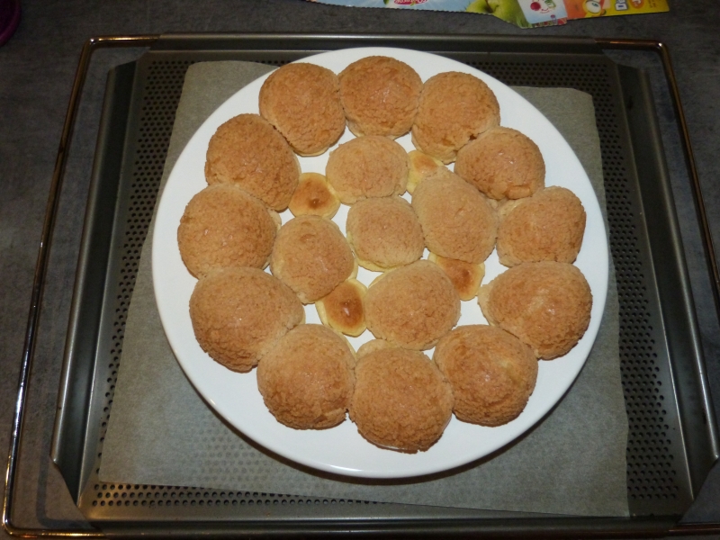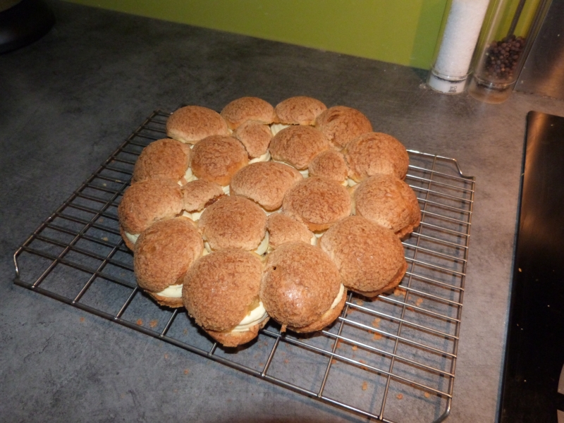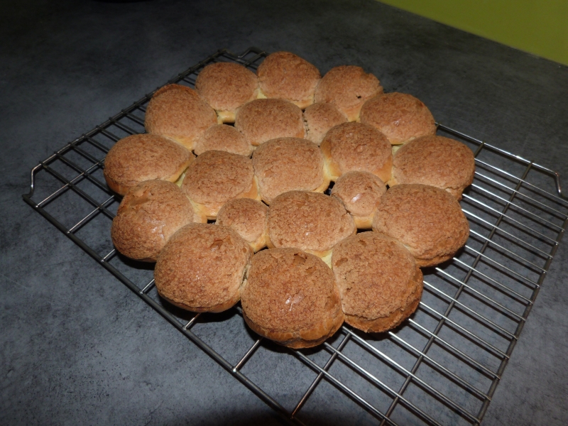 Baissez votre four a 190° et enfournez. La norme de cuisson pour des choux est de 20 à 25 min à 190°, puis 10 à 15 min four ouvert à 160°, j’ai suivi ces recommandations pour ma première fournée, grosse erreur, tous les choux du milieu se sont affaissés dès l’ouverture du four. J’ai du revoir ma copie, et refaire une tournée, que j’ai laissé cette fois 40 min à 190°, puis 20 min a 160° four entre-ouvert.
