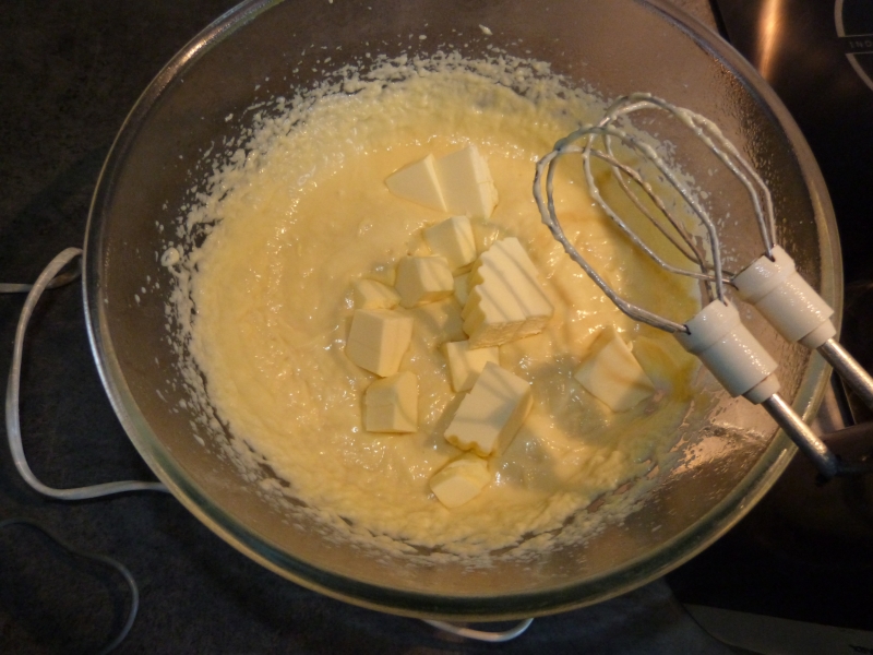 Commencez à fouettez la crème tout en contrôlant sa température. Lorsque la pâtissière est descendue a 50°, ajouter la première moitié de beurre, et continuer a fouetter.