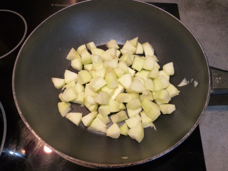 Faites chauffer une grande poêle, mettez y le beurre et les morceaux de pomme.