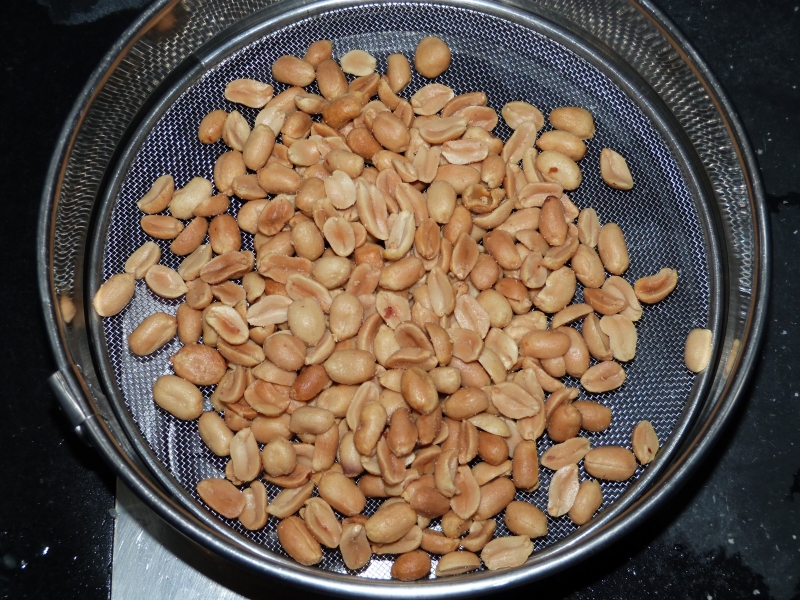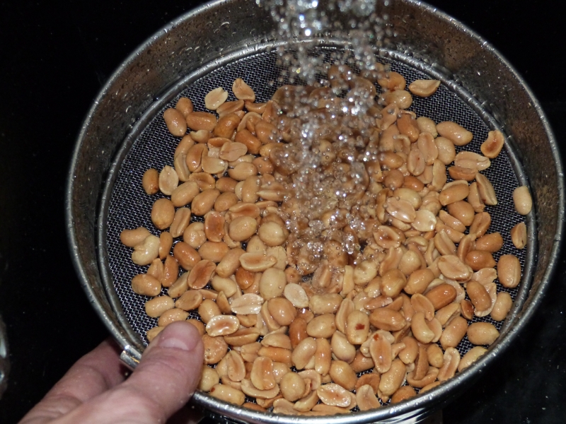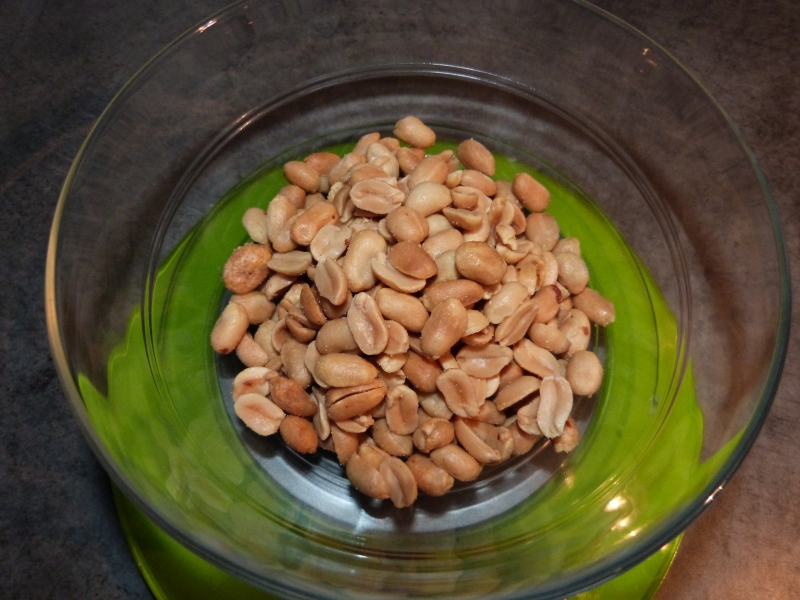 Dessalez les cacahuètes en les passant sous un filet d’eau, puis séchez les en les passant au four a 150° pendant 10 a 15 min.