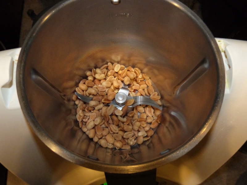 placer les cacahuètes dans le bol du Thermomix et donner 2 coup de turbo pendant 1 sec chacun.