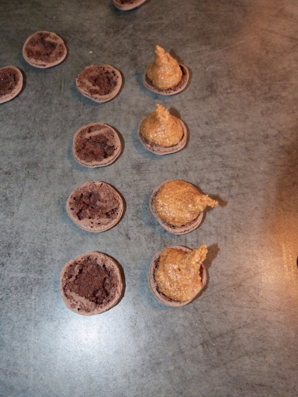 Lorsque le mélange est homogène, placez le dans une poche sans douille (il reste quelques gros morceaux de cacahuètes qui ne passeront pas le trou de la douille) et dressez vos macarons.