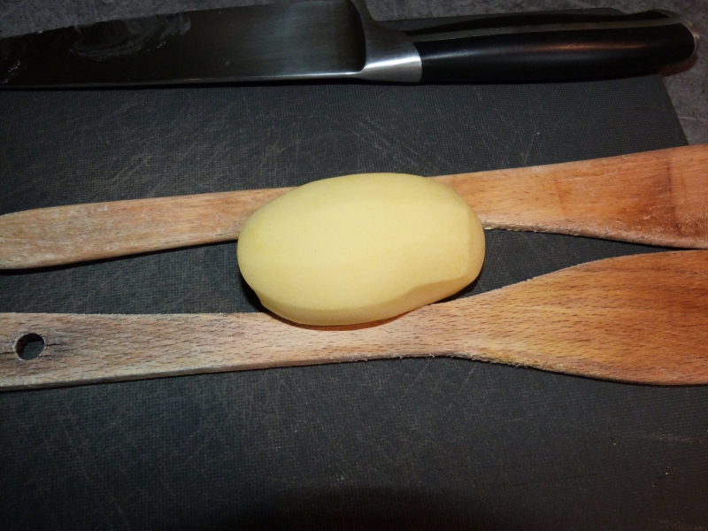 Séchez, et munissez vous de deux spatules plates. Posez une pomme de terre entre les deux spatules et coupez de fines tranches dans la pomme de terre sans aller jusqu’au bout (les spatules vous servent de guide)