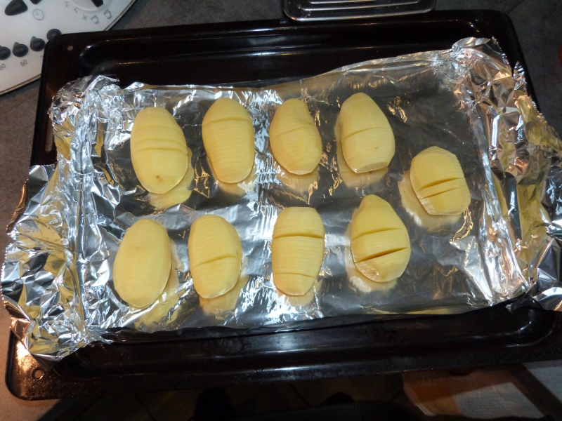 Je suis tombe il y a quelques temps sur l’image d’une pomme de terre au four présentée d’une manière un peu insolite, et j’ai vraiment eu envie de tenter le coup. Le résultat est a la hauteur de mes attentes, c’est bon, c’est différent de toutes les autres formes de cuissons, enfin bref, un vrai bonheur.