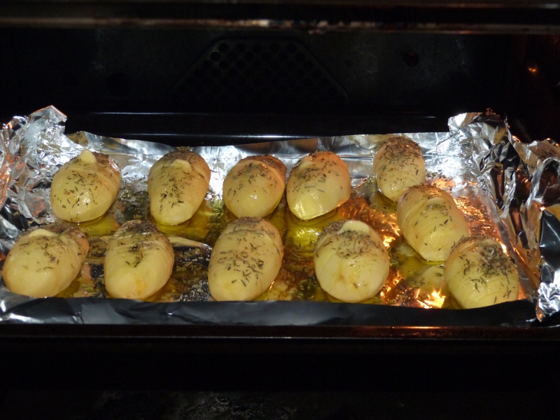 Une fois l’opération réalisée avec toutes les pommes de terre, disposez les sur une feuille de papier alu, le tout sur une plaque (relevez les bords de la feuille d’alu, nous allons ajouter une bonne quantité d’huile, et ça lui évitera de couler a coté)