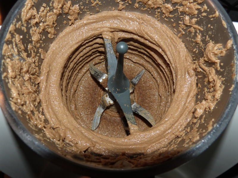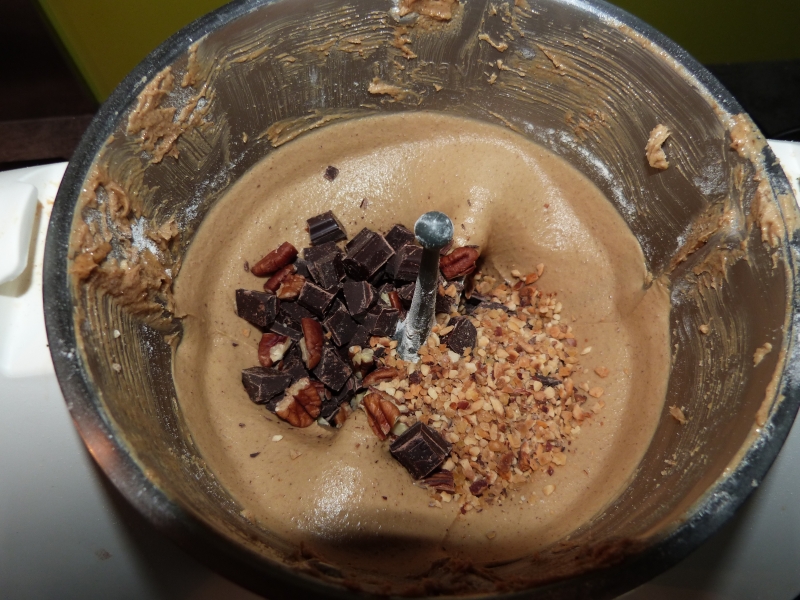 Enfin, ajouter les chunks, noix de pécan et éclats de nougatine (j’ajoute parfois un peu de pâte de praliné pour donner encore un peu plus de goût, compter 15 à 20 g) et mixer en sens inverse, 15 secondes vit 1 et demi.