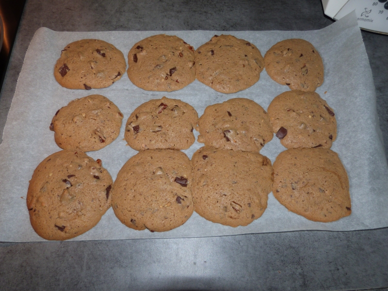 enfournez pour 20 min environ, le temps de cuisson est très important. Si vous laissez trop longtemps, vous obtiendrez des cookies très croustillants, en contrôlant très attentivement la cuisson, vous parviendrez a sortir des cookies dont le tour est croustillant et l’intérieur moelleux. C’est comme cela que je les préfère. Pour obtenir cette consistance, les cookies ne doivent pas être trop dur au toucher à la sortie du four, ils se figent en refroidissant. Cela demande un peu d’entrainement pour connaitre la bonne consistance. Une fois sortis, laissez les refroidir sur une grille et conservez les dans une boite hermétique.