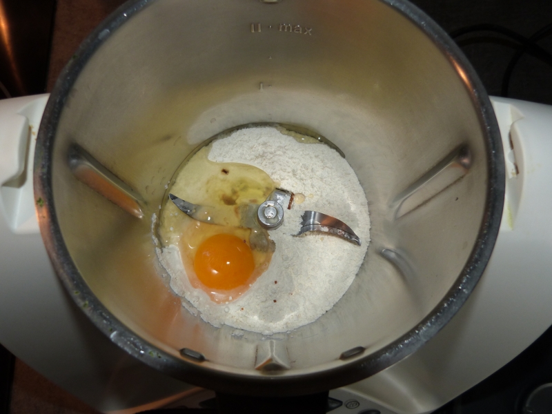 Pour la pâte, je suis parti sur une recette que l’on trouve dans a peu près tous les bouquin Thermomix (dans la partie B.A.BA) qui est la celle de la pâte sablée donc j’ai juste divisé les quantités par deux et modifié quelques touches ici et la. Donc :