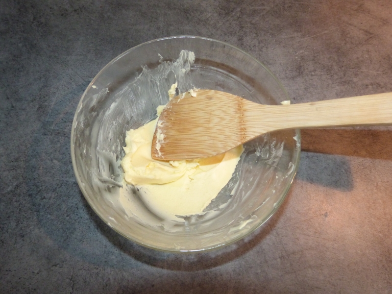 Travailler le beurre a la spatule pour qu’il soit bien pommade et le mettre dans le bol avec les autres ingrédients.