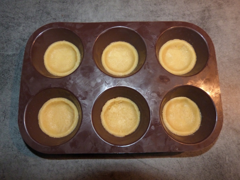 Découpez donc a l’emporte piece des morceaux de pate, et collez les avec les doigts au fond du moule, et appuyant bien sur les parois pour donner une belle forme aux gateaux :