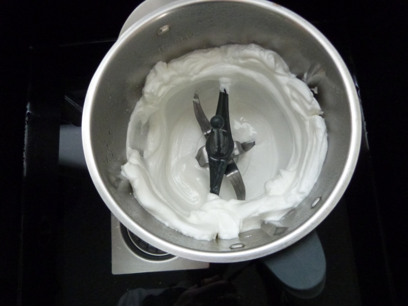 – Une première fois, j’ai laissé le Thermomix tourner pendant une bonne demi-heure pour laisser la meringue refroidir naturellement, le rendu était liquide.