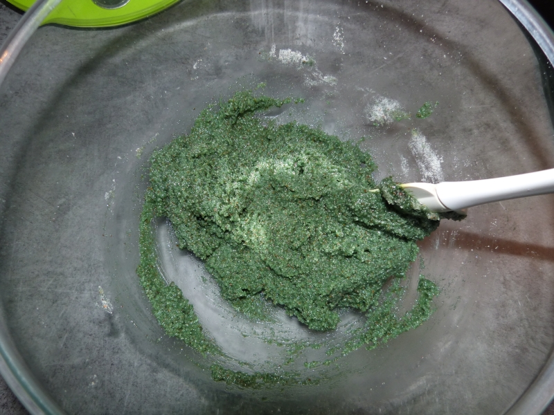 Pendant le refroidissement, ajouter le colorant au mélange de poudre, puis mélanger le reste des blancs d’oeufs pour obtenir une sorte de pâte d’amande.