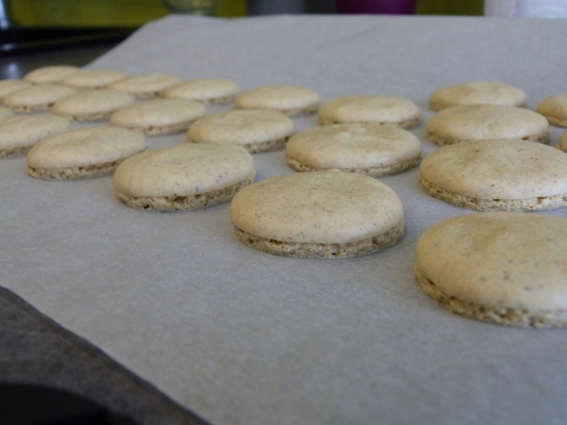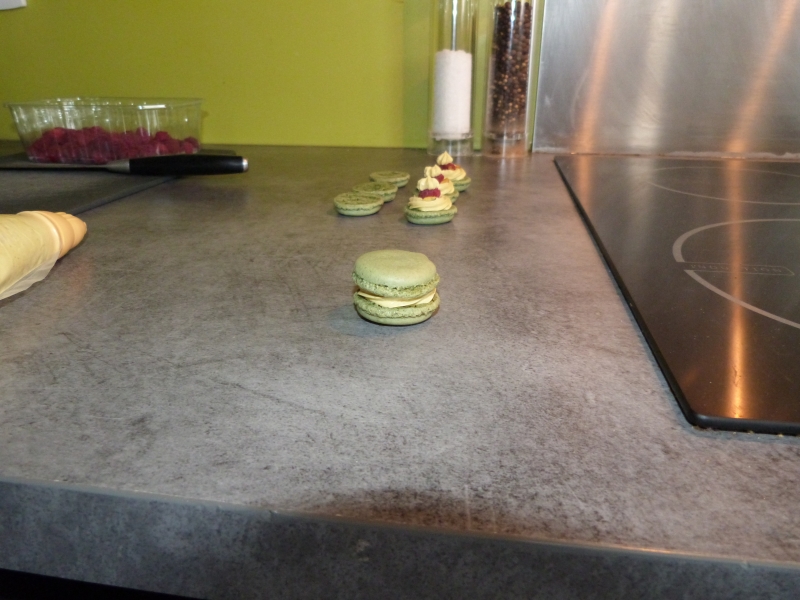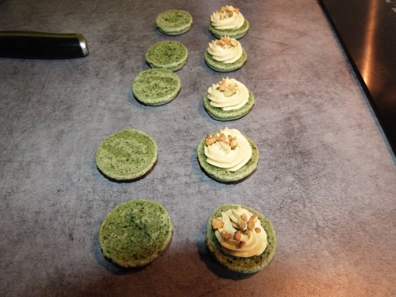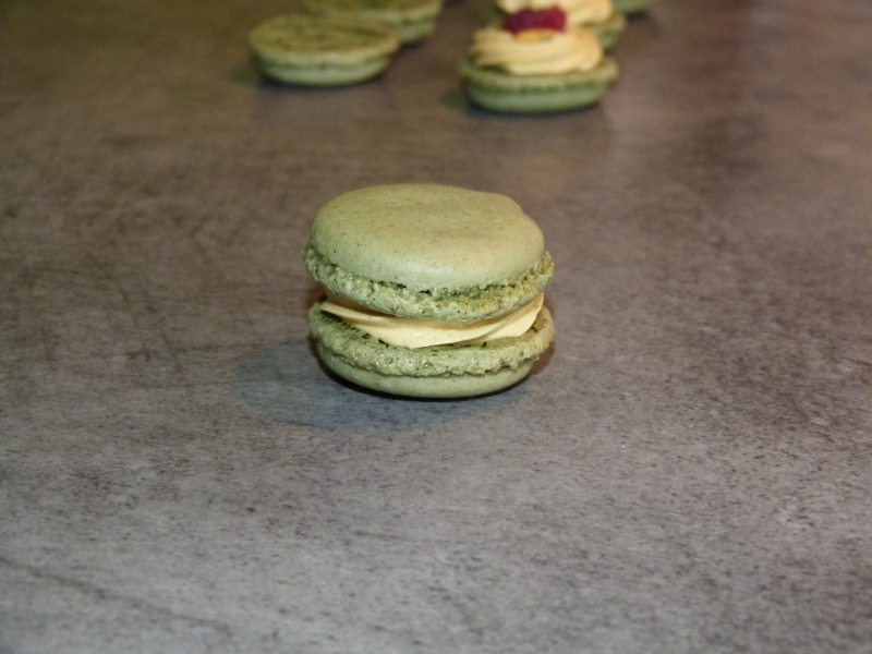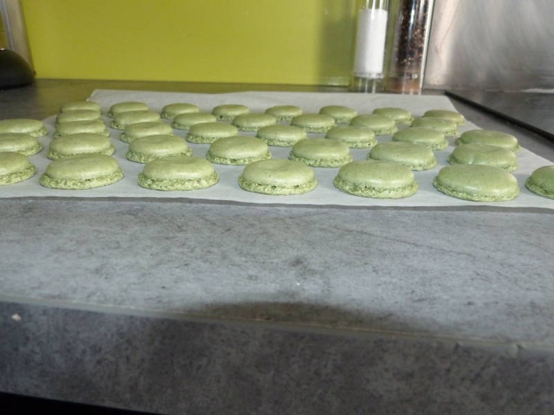 Pour faire simple, pour les coques, au lieu d’utiliser seulement de la poudre d’amande, j’ai fait un 50% amande 50% pistache (retrouver comment obtenir votre propre poudre de pistache ici), j’ai aussi ajouté dans la préparation du sirop 2-3 gouttes d’amande amère pour relever le tout, c’est a peu près tout. La recette de base est toujours celle ci, j’ai juste ajouté un peu de colorant vert parce que le premier résultat n’était pas probant en terme de couleur :
