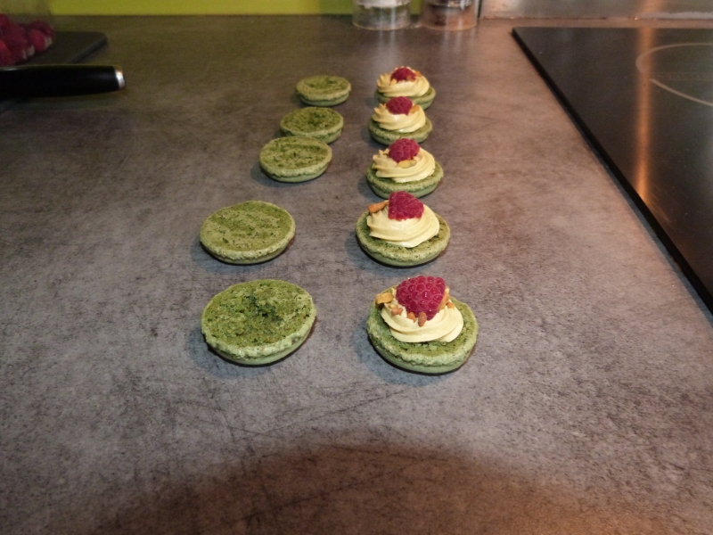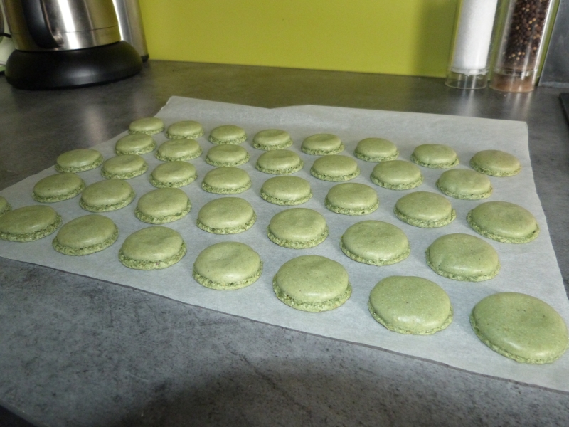 Donc pour résumer, suivez la recette comme d’habitude, seulement, en lieu et place des 150g de poudre d’amande, comptez 75g de poudre d’amande et 75g de poudre de pistache.