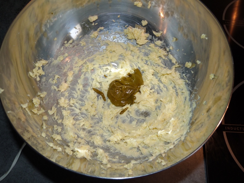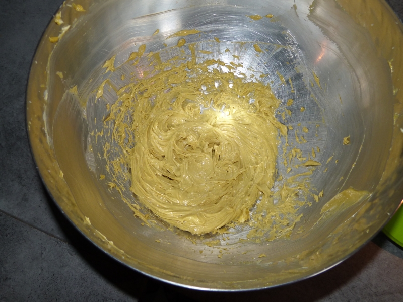 puis, quand il est bien crémé, ajouter les 40g de pâte de pistache.