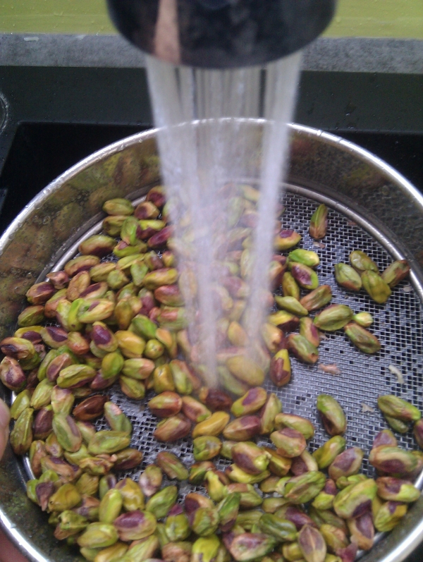 Passez ensuite vos pistaches sous un filet d’eau en remuant bien les fruits pour bien les laver et retirer tout le sel.