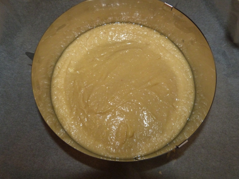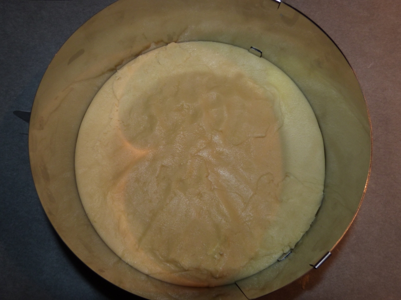 Pour commencer, la recette originale se fait dans un rectangle, je n’en ai pas, j’utilise donc un cercle extensible. Les quantités données sont bonnes pour un carré de 20×20 cm. Par un calcul savant, on trouve que la même quantité de pâte doit tenir dans un cercle d’un peu plus de 22 cm, je règle donc mon cercle a 22,5 cm.
