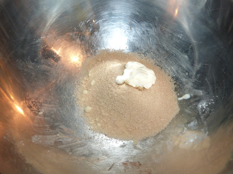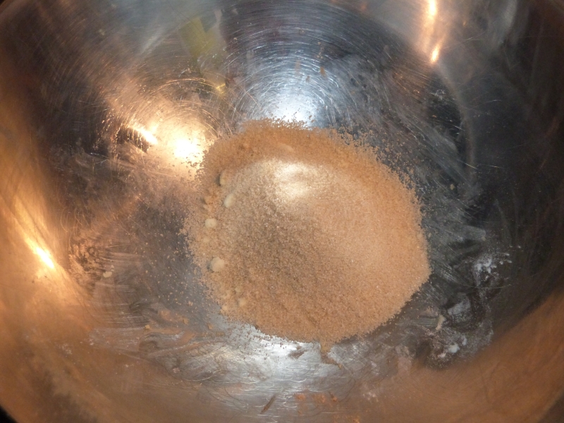 Mélangez poudre d’amande, cassonade, beurre et crème fraîche.