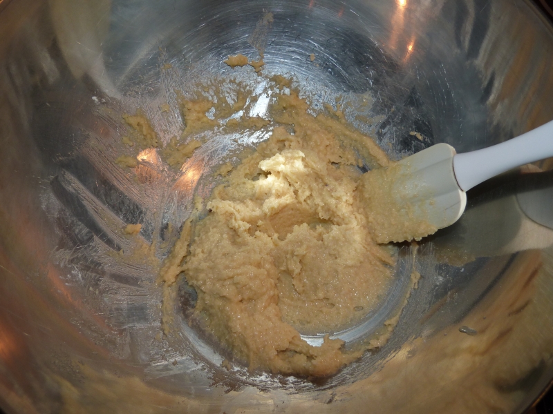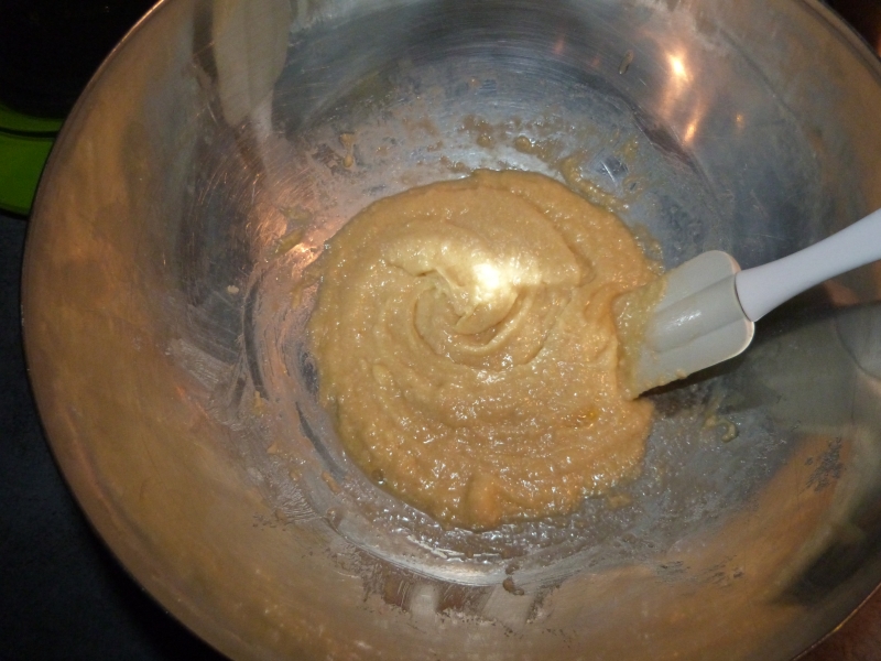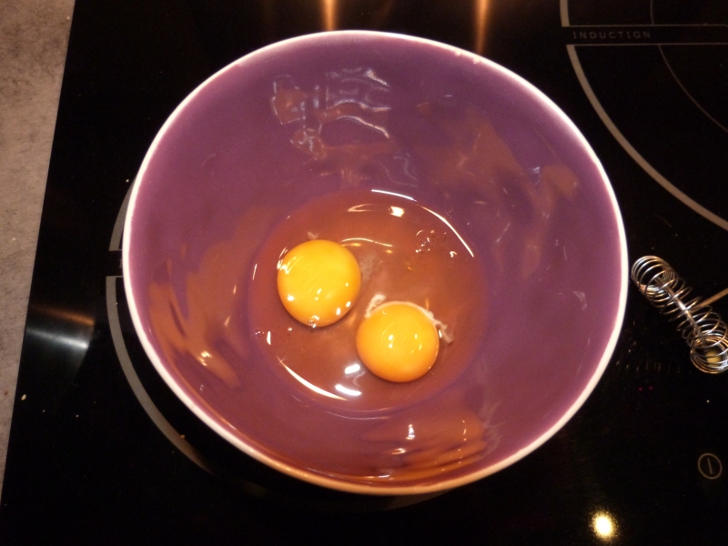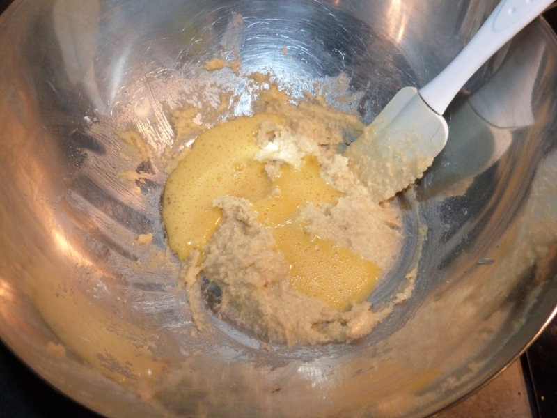 Viens ensuite l’ajout des œufs. Comme la recette indique 75g, et qu’il est important de suivre les quantité à la lettre, battez 2 œufs en omelette ensemble et pesez 75g de ce mélange.