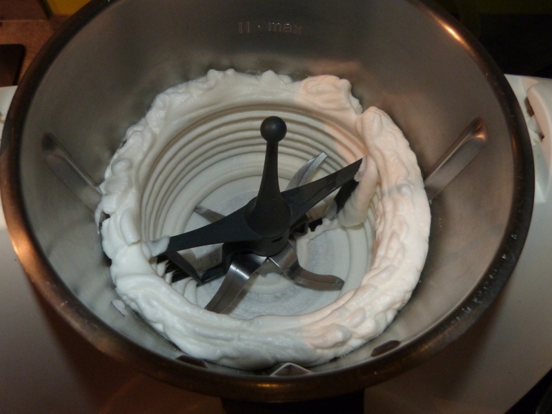 Commencer par séparer les jaunes des blancs d’œufs, et réserver les jaunes. Placer le fouet dans le bol du TM, verser y les blancs et programmer 5 Min Vit 3 et demi.