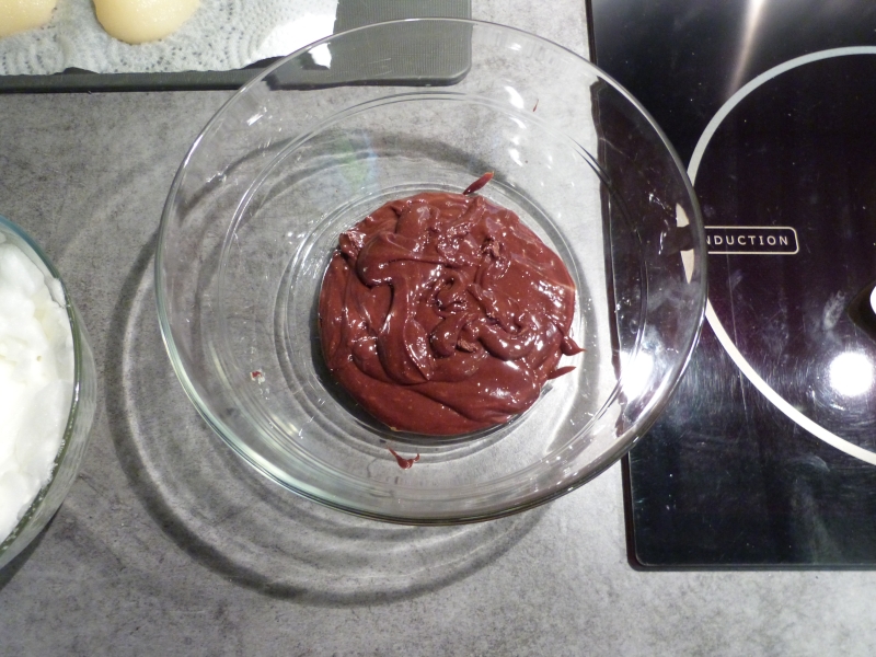 (ici la photo de mon premier essai, avec une demi mousse au chocolat, on peut encore voir les poires sur le dessus)