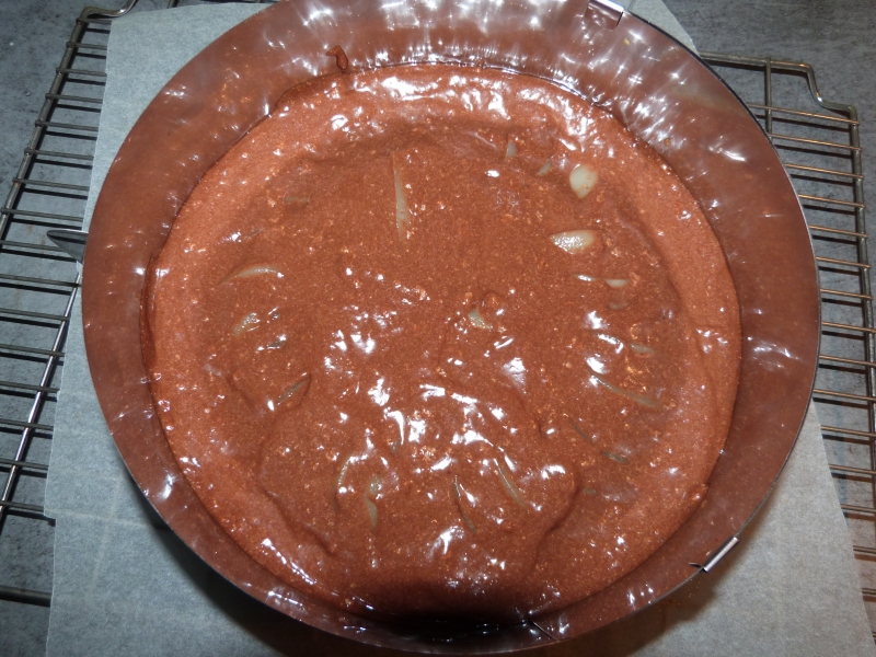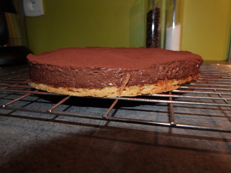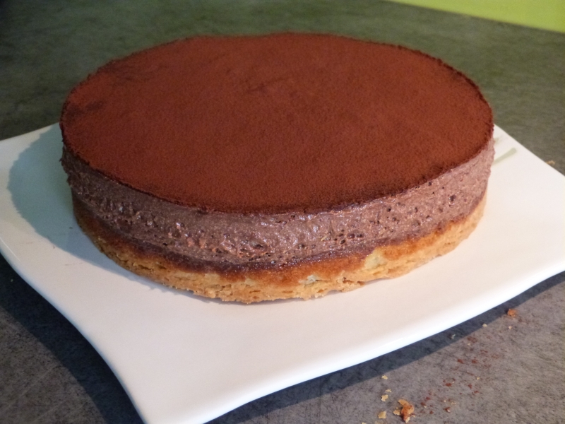 Donc, voici le montage, une fond shortbread / crème d’amande, des morceaux de poire entiers recouvert de mousse au chocolat.