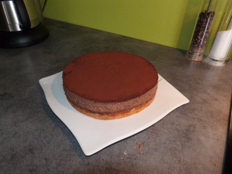PS : les petits détails a ne pas manquer, ne mettez pas trop de cacao sur le dessus de la tarte, juste de quoi faire une belle décoration. Ensuite, pensez bien a resserrer le cercle avant de verser le mousse. Pour exemple, je ne l’avais pas fait pour mon premier essai, et voila ce que cela donne :